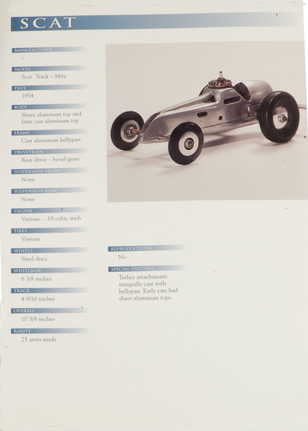 According to Eric Zausner’s book, Spindizzies, Gas Powered Model Racers [1], there were only 25 (twenty five!) of these Scat racers ever built. This and other information about the Scat tether car can be found on page 215 in [1], of which I included a picture above (see last picture, picture #21). According to the information on page 215 in [1], there are no reproductions of the Scat made. This was still true in 1998, when the book was printed.
