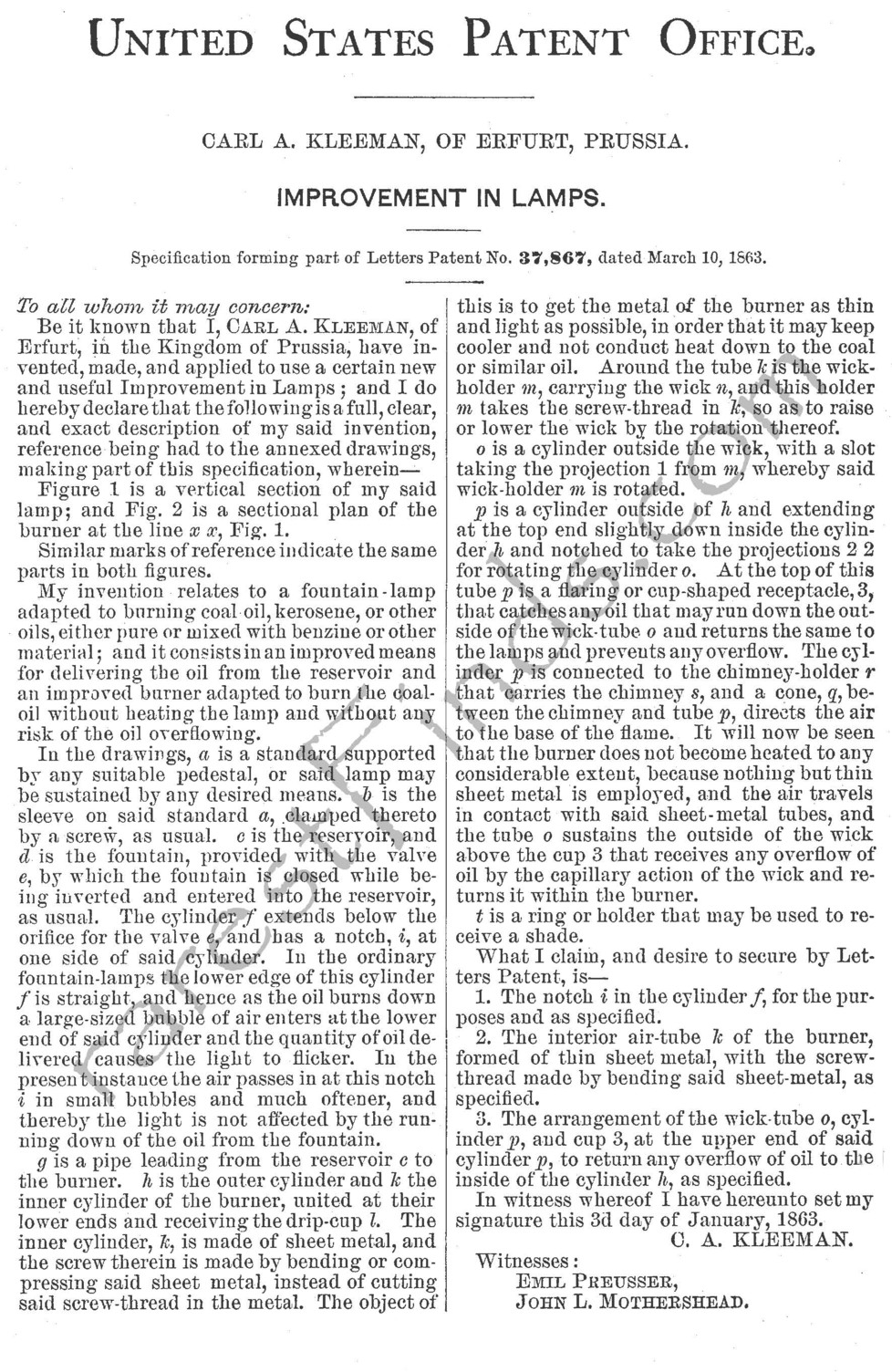 The lamp's superior performance was due to its scientifically constructed burner, which optimized airflow for more complete combustion. Unlike traditional flat wicks, the Argand lamp or burner used a cylindrical, or tubular hollow wick held between two concentric metal tubes, see picture 14.