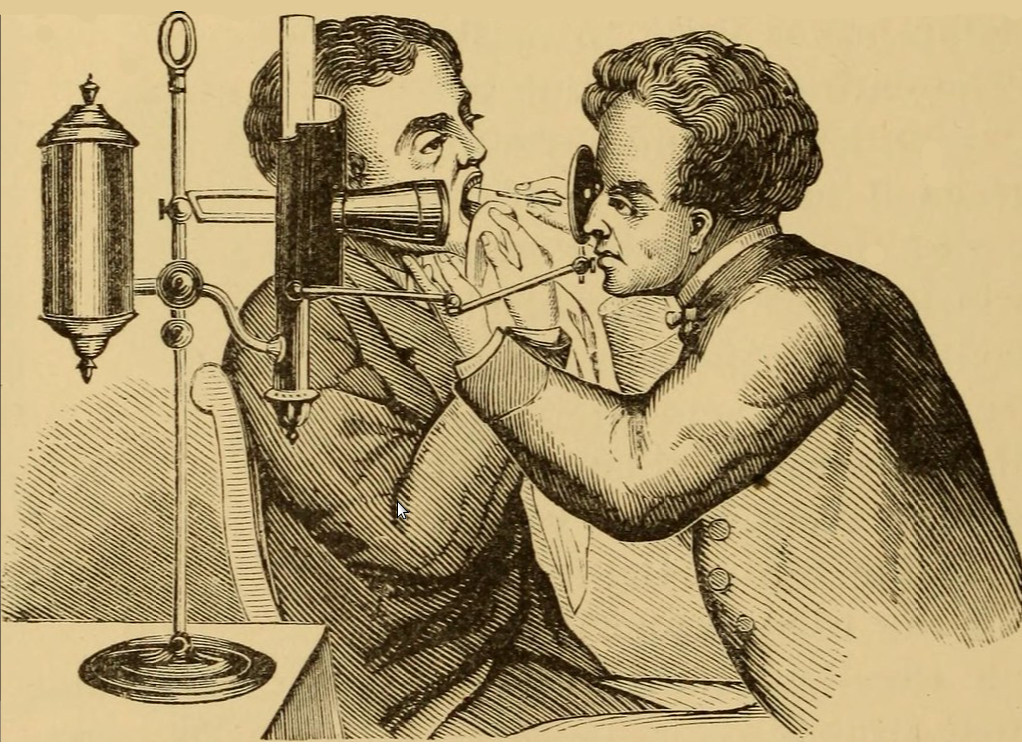 The history of indirect laryngology is complex; the vocal pedagogist Manuel Garcia (1805-1906) is credited with having done it first. In 1854, he became the first man to view the functioning glottis and larynx in a living human, or at least, he was the first to document it. Garcia developed a tool that used two mirrors for which the sun served as an external light source. Using this device, he was able to observe the function of his own glottic apparatus and the uppermost portion of his trachea. He presented his findings at the Royal Society of London in 1855.