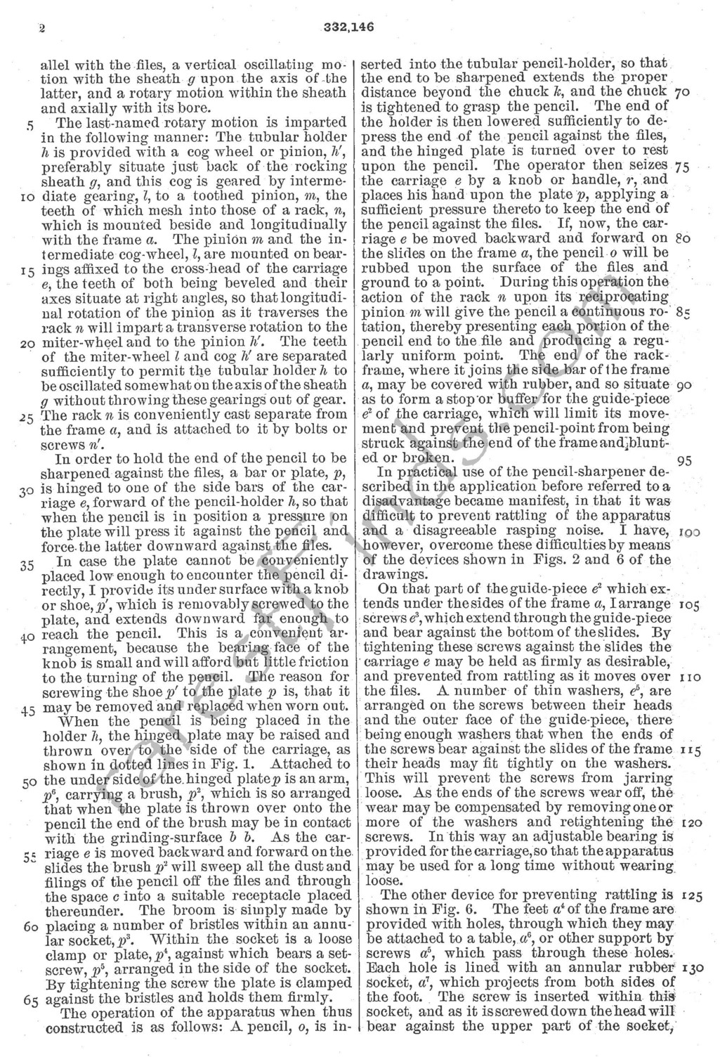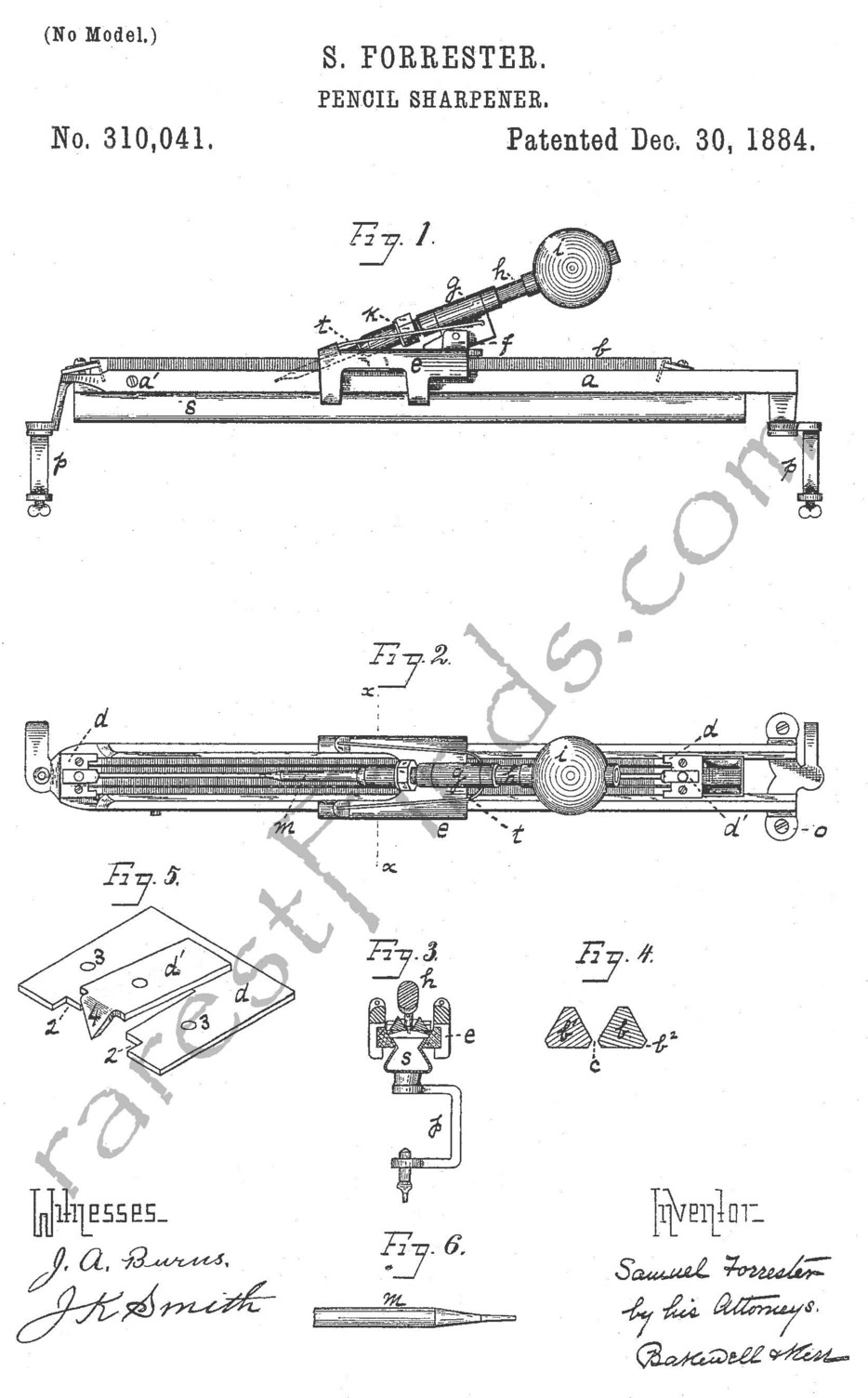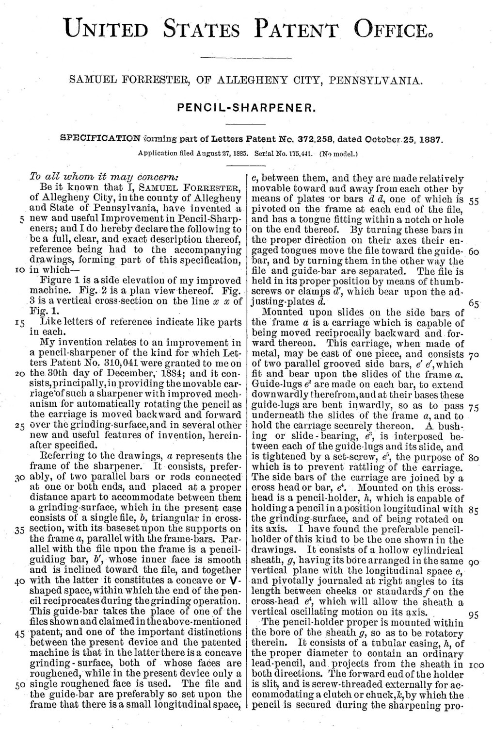 There is one Forrester pencil sharpener known to exist with the remark "PAT APPLD" cast into the cast iron frame of the pencil sharpener. The one offered here has the patent date of his third patent cast into the pencil sharpener, the patent date "Oct. 25. 1887." Both of these known machines resemble the machine protected by Forrester's third patent for a pencil sharpener, patent no. 372,258. The obvious element of Forrester's third patent is the use of the "cord or strap" running around "pulleys" causing a rotary motion of the "sheath" and chuck holding the pencil.