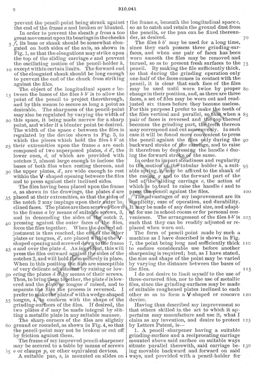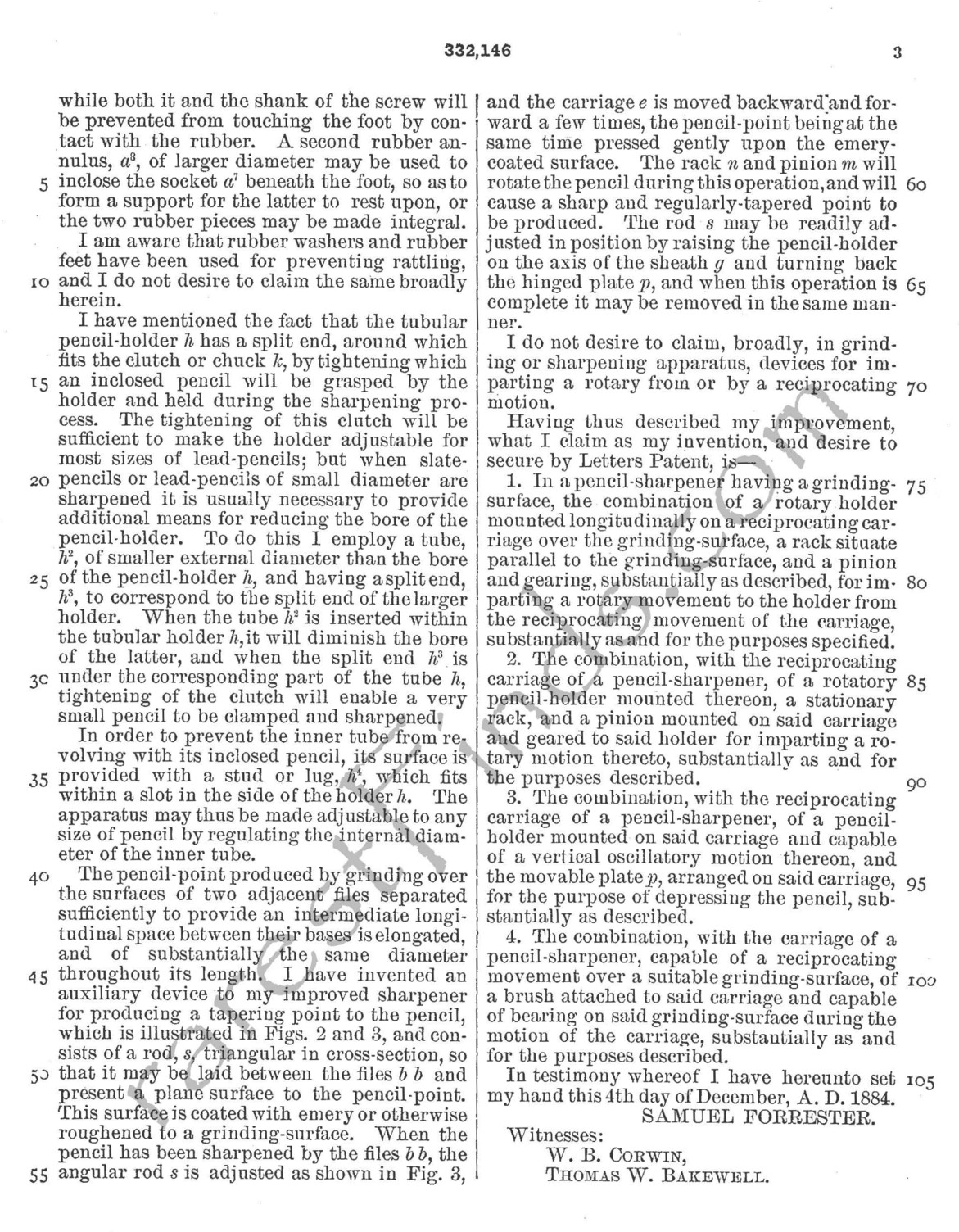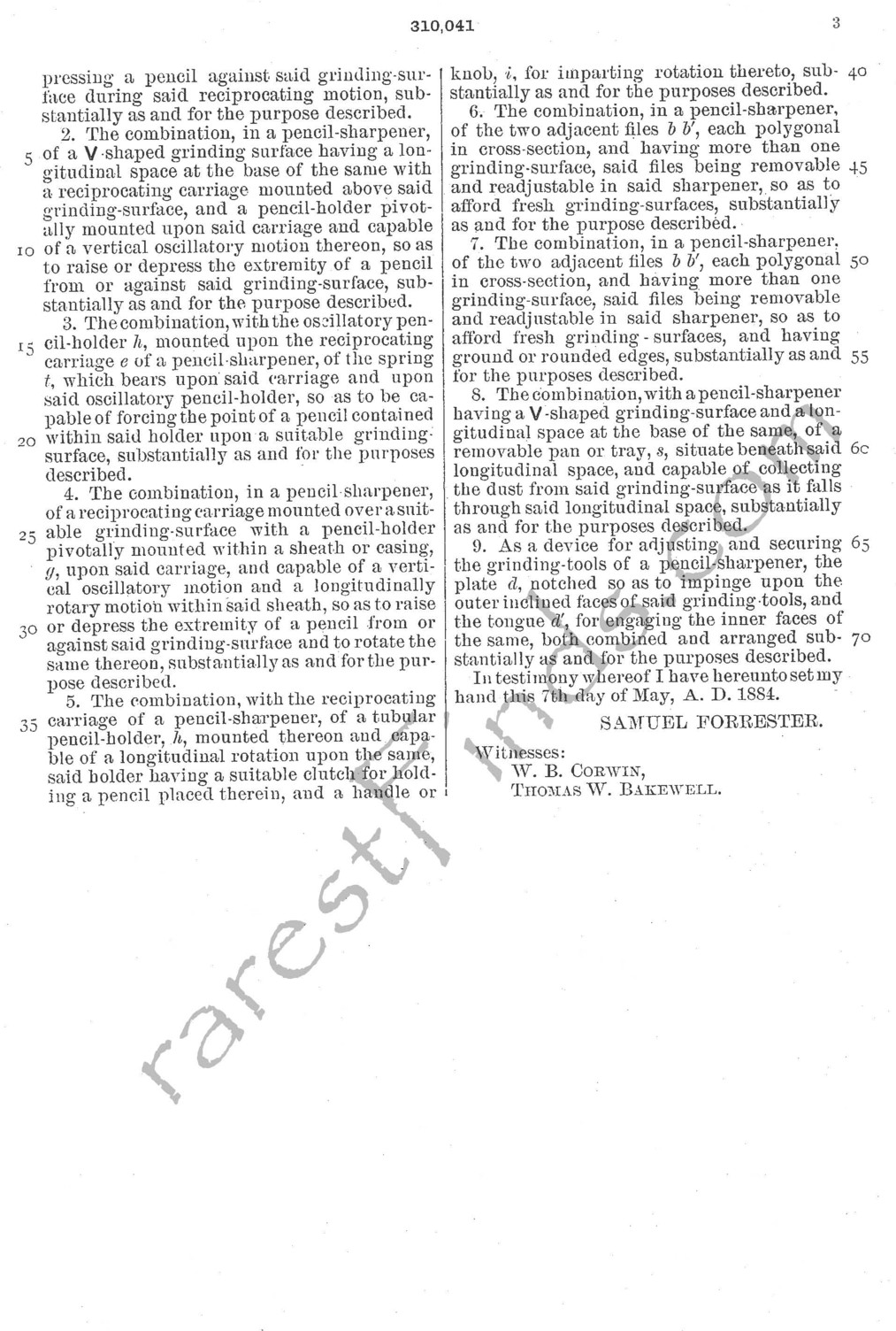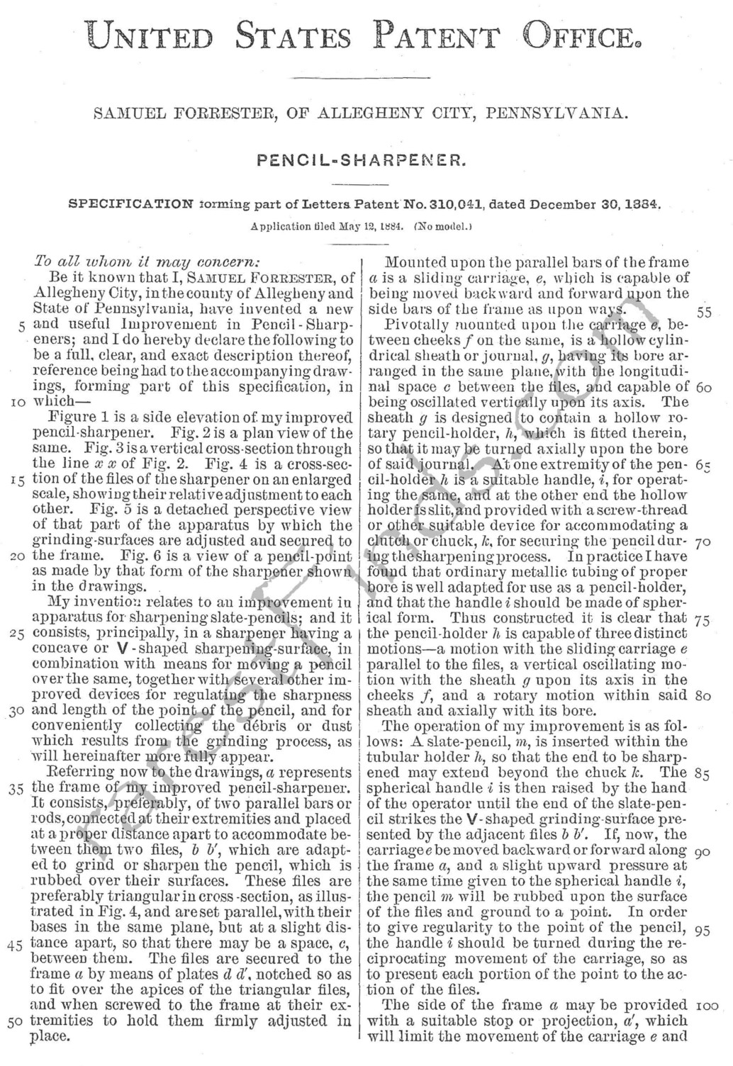 Forrester applied for a total of seven patents. His first patent was granted on December 7th, 1869, patent no. 97,623 for a CARRIAGE AXLE; the second patent issued on December 30, 1884, patent NO. 309,843, for a CALF WEANER. The three patents for his mechanical pencil sharpener followed. The first patent of the three issued the same day as the CALF WEANER.
