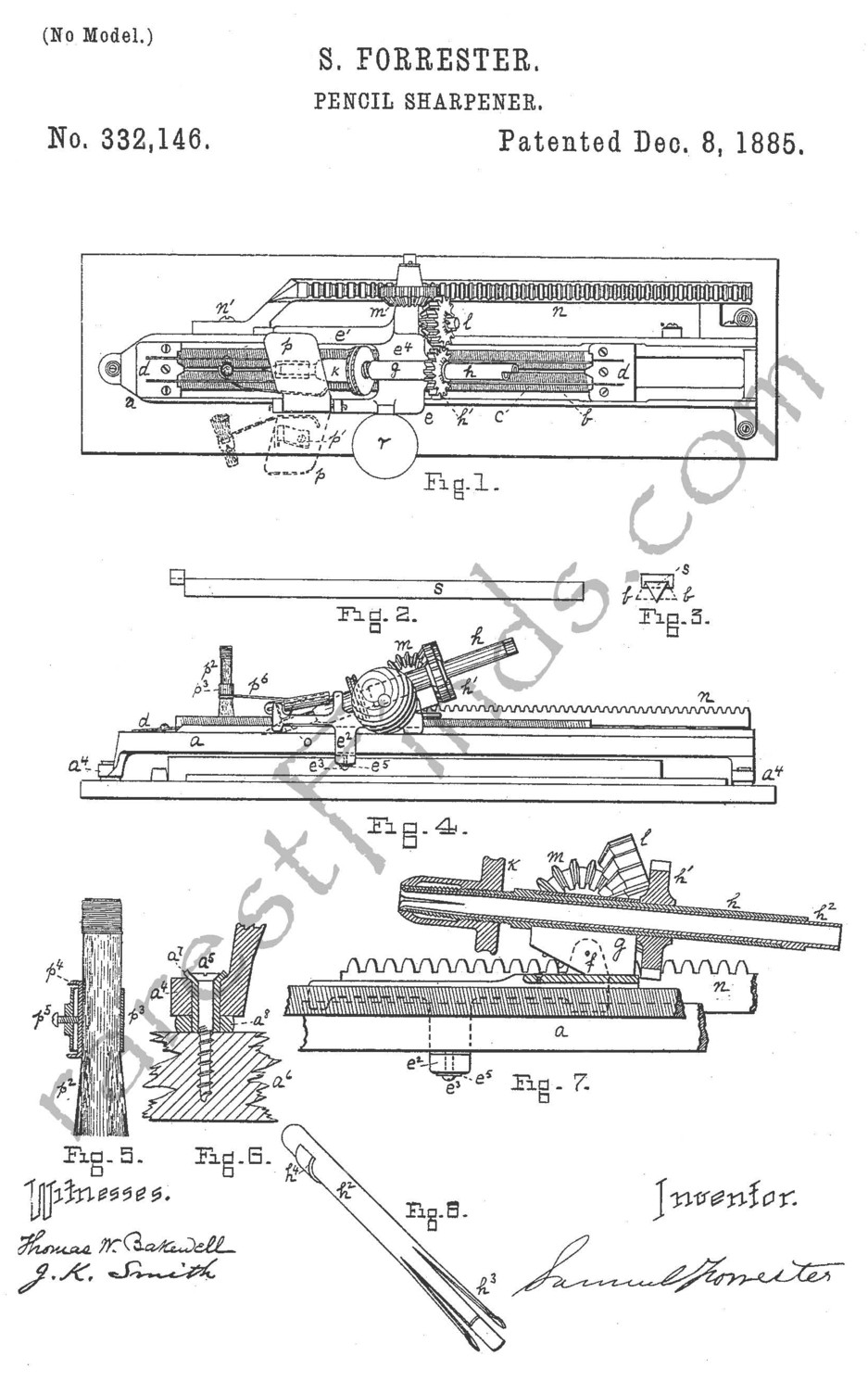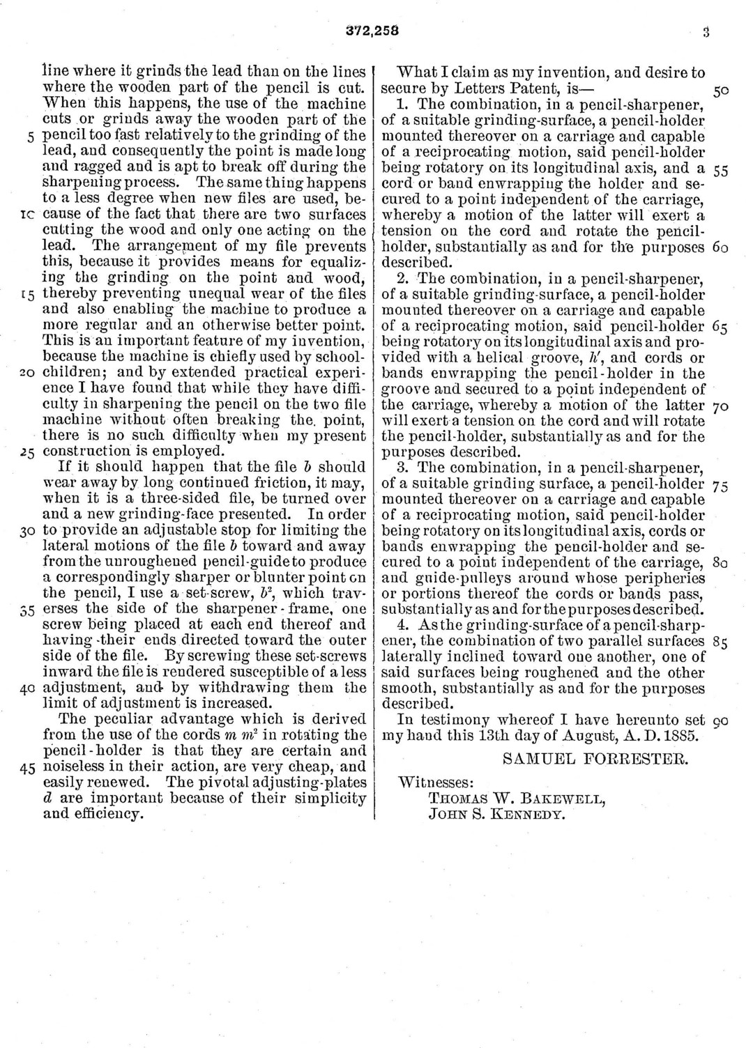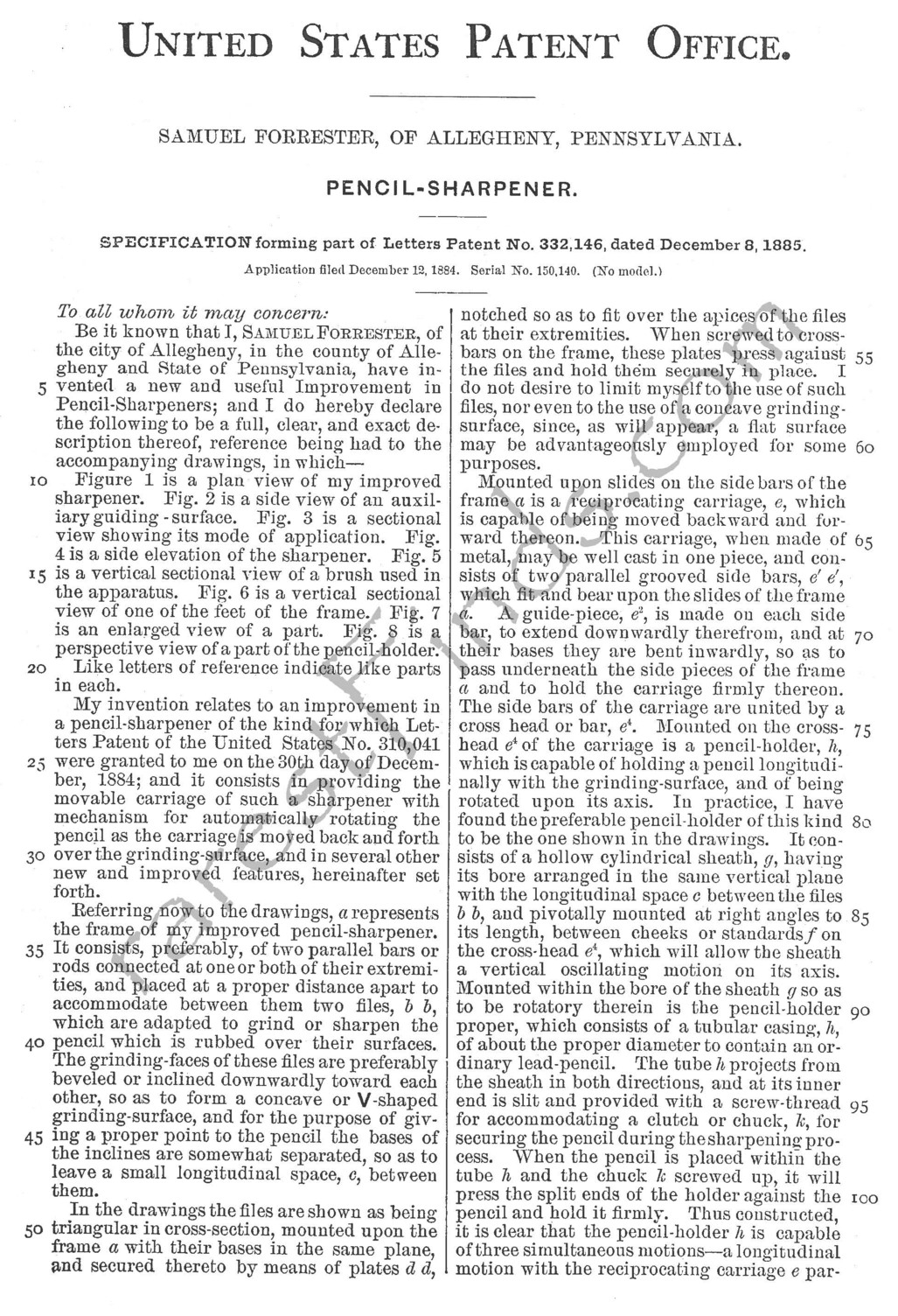 Samuel Forester produced a unique record of his efforts to invent and improve his pencil sharpener. His thought process is thoroughly documented in his three patents he applied for and were granted. For the readers convenance, all three patents are published above; just click on any thumbnail picture to download a large image.