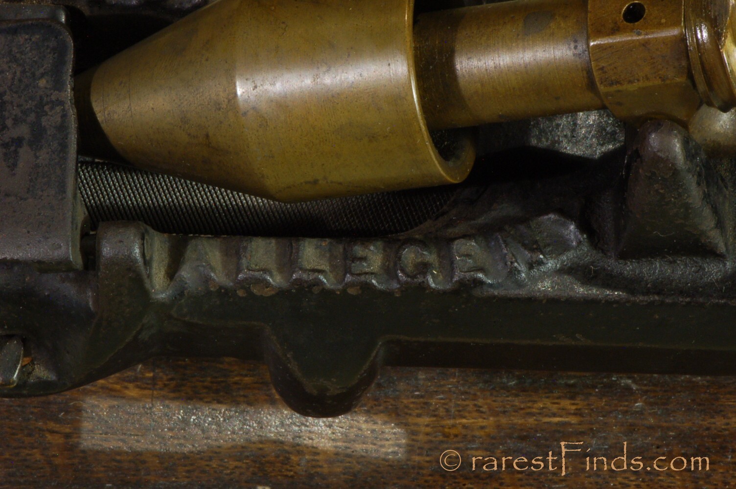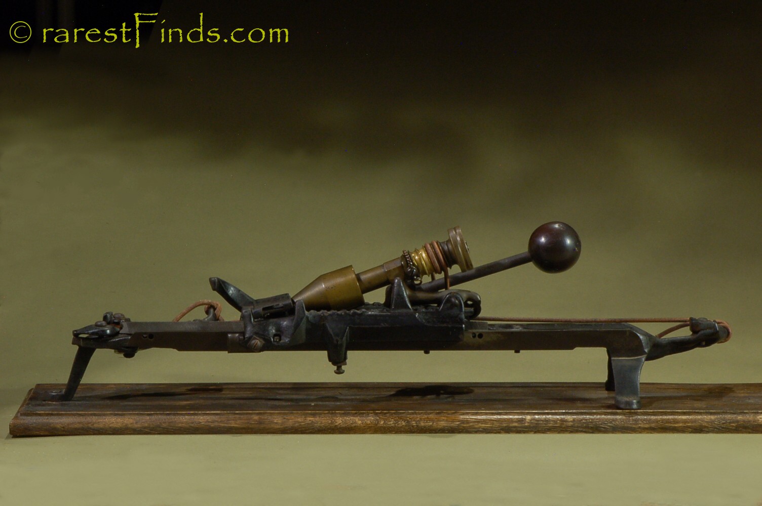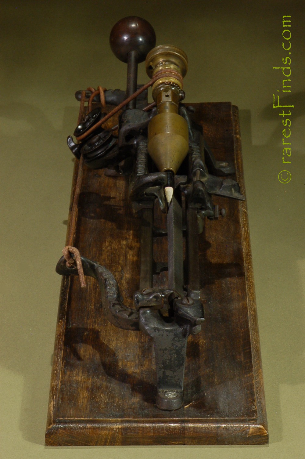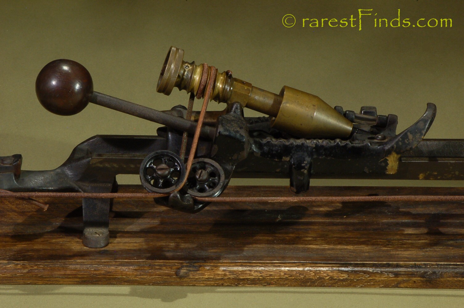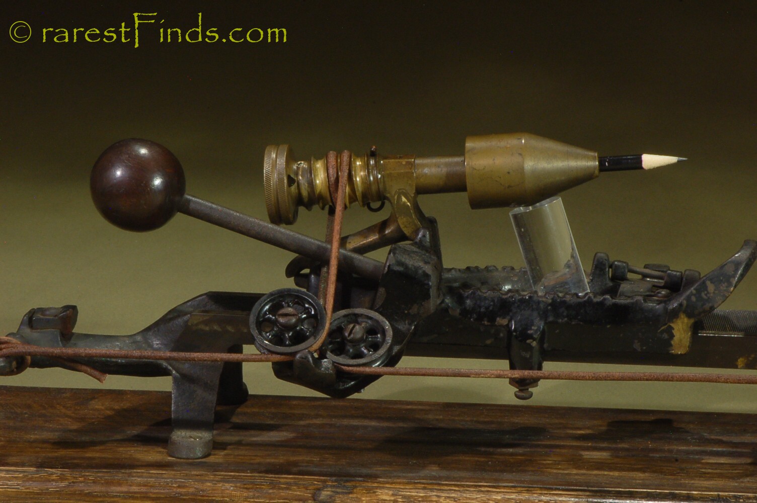 This Exceedingly rare pencil sharpener shows surface patina consistent with its age. Everything moves and with some patience the machine even sharpens a pencil. The file is somewhat dull and the machine does not work well. I could not find any replaced parts or any damage. There is nothing missing. some of the parts, like screws too long for the purpose (the two screws holding the two pulleys are way too long), and filled-in holes, which were part of a design that was abandoned later on, are an indication that the machine was only produced in very small numbers.