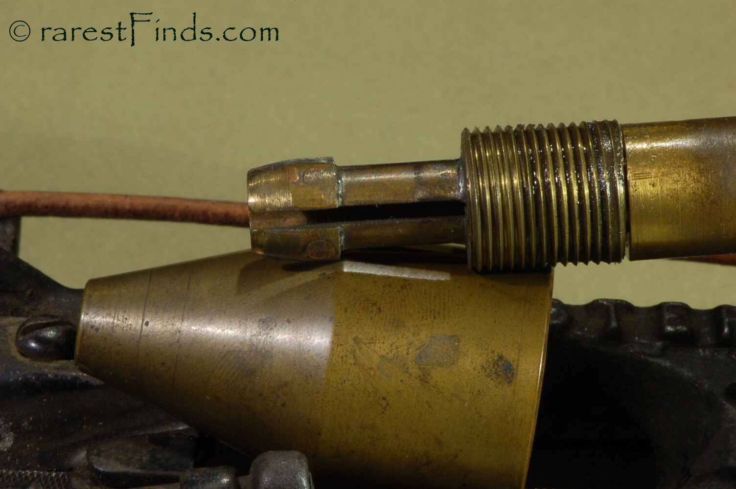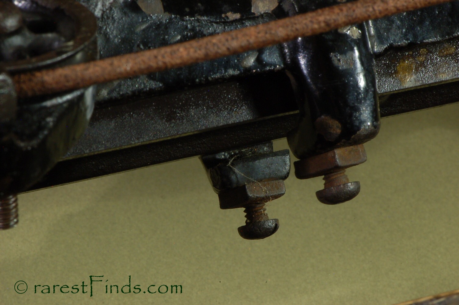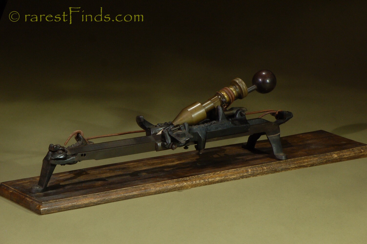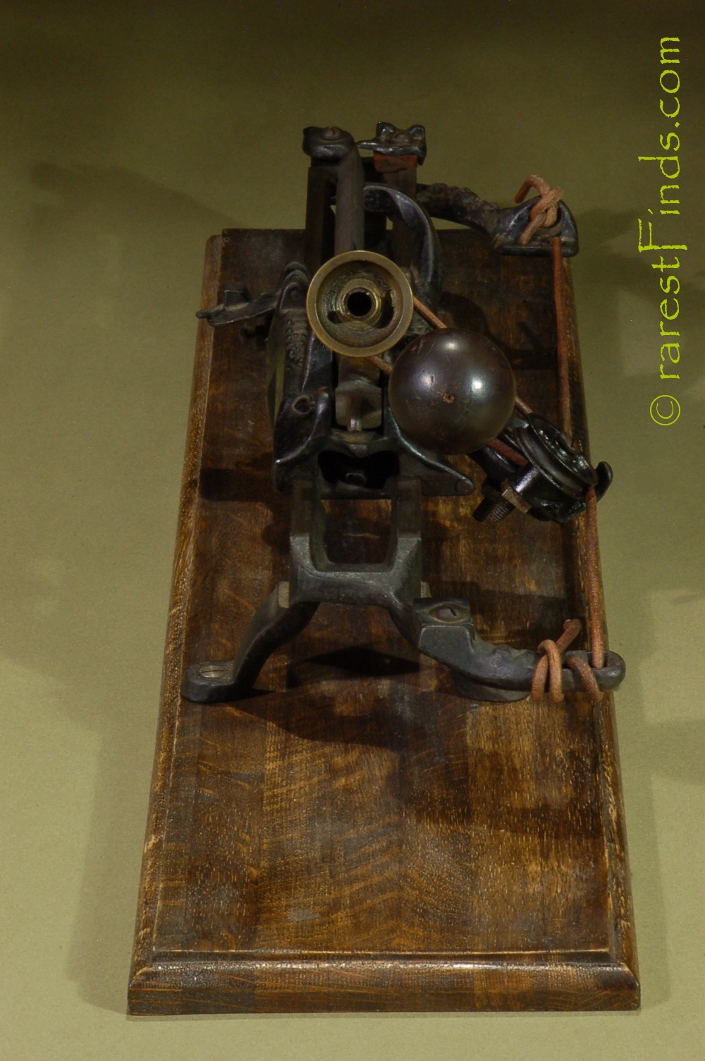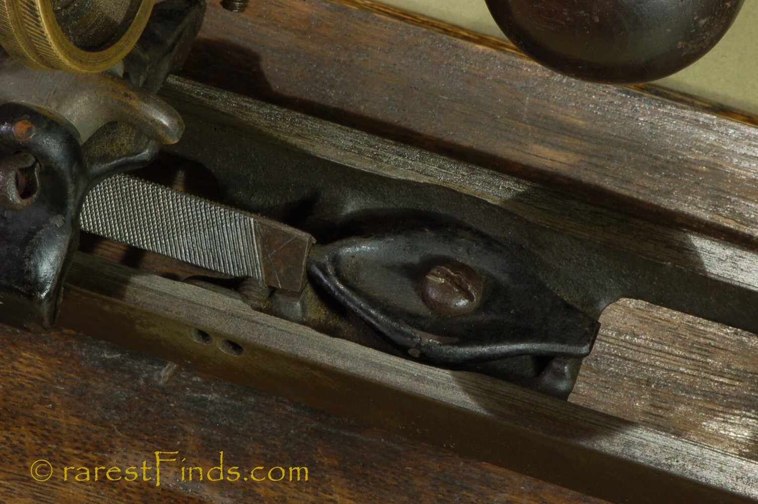 This Exceedingly rare pencil sharpener shows surface patina consistent with its age. Everything moves and with some patience the machine even sharpens a pencil. The file is somewhat dull and the machine does not work well. I could not find any replaced parts or any damage. There is nothing missing. some of the parts, like screws too long for the purpose (the two screws holding the two pulleys are way too long), and filled-in holes, which were part of a design that was abandoned later on, are an indication that the machine was only produced in very small numbers.