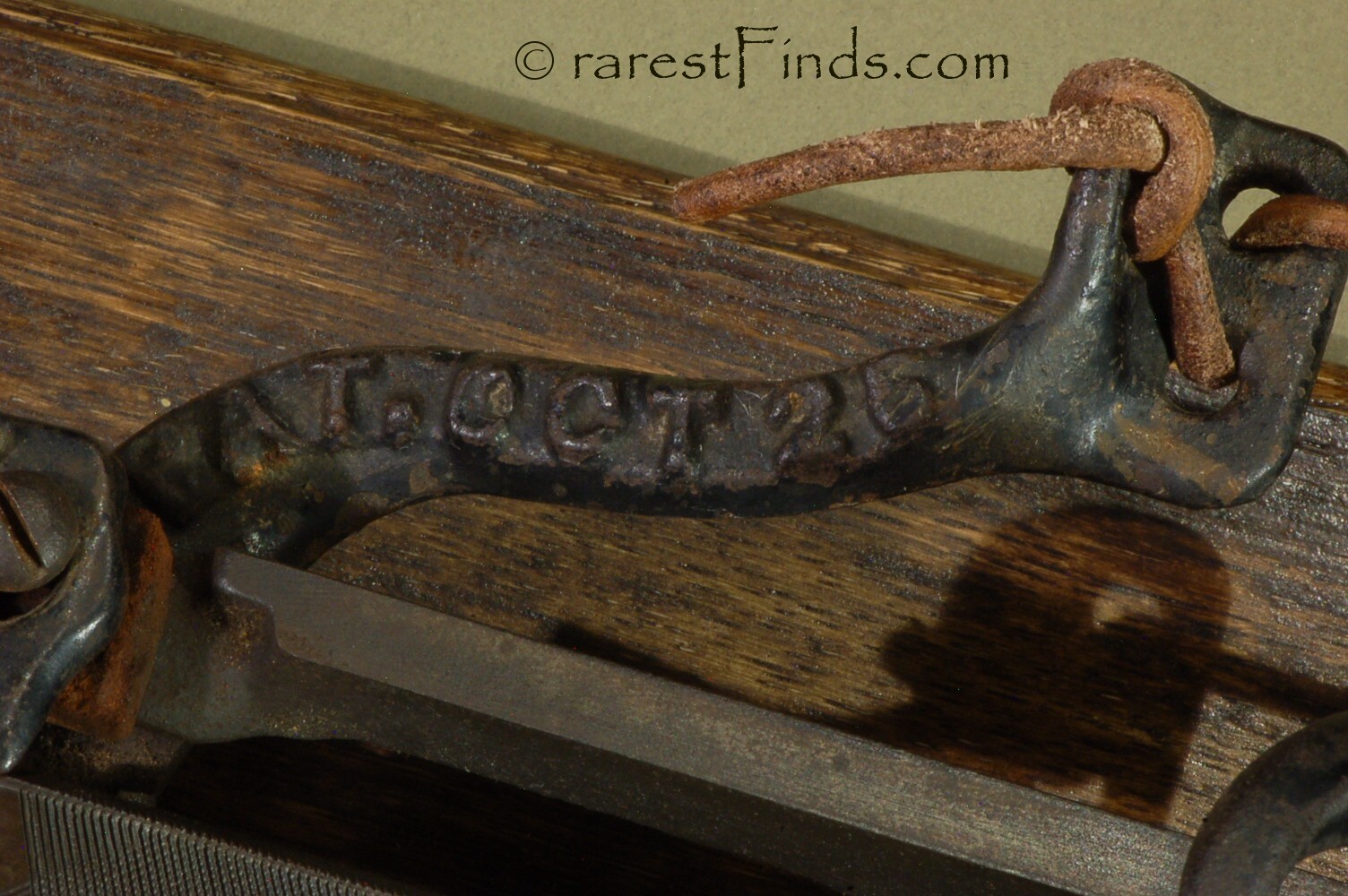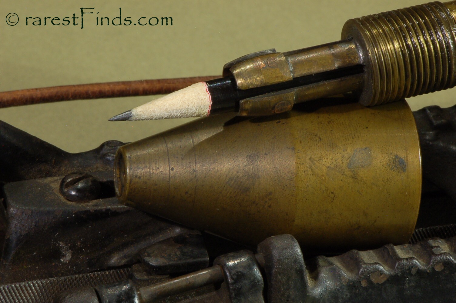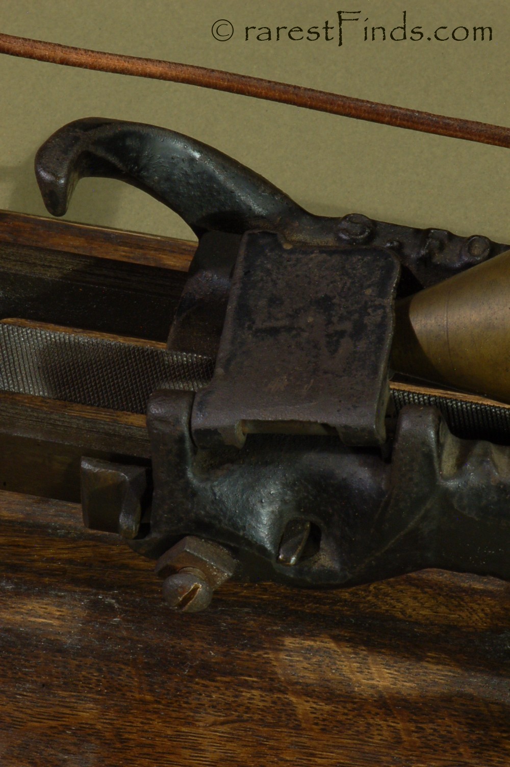 The pencil sharpener has a stationary, precision ground bed, with two tracks, on which a carriage travels back and forth, like a carriage on a metal lathe. The carriage has a slanted brass sheath attached, into which the pencil is inserted. At the end of the sheath is a knurled knob to adjust the leather cord's position, see picture # xx.The sheath has a hole to oil the sheath, see pictures 8 and 9.The sheath has at its end towards the file a brass chuck to hold or grab the pencil, not unlike you would find on a drill, see pictures 10-12. Picture 12 shows the threaded nut or sleeve removed from the three jaws holding the pencil. The sheath has a grove with five turns to accommodate the cord or strap, right now a thin leather cord is mounted. This cord is attached with a knot through holes on either end of the pencil sharpener. The arm on the left side, side with one leg, is removable to allow the carriage to be slid onto the two tracks of the bed. The carriage has two set screws on the bottom to adjust the vertical play between the carriage and the bed, see picture 20. There is also a provision to adjust the horizontal play between the carriage and the front track of the bed, see picture 17; the screw is located underneath the flap which covers the spot where the pencil is being sharpened. The frame of the pencil sharpener has two legs on the right hand side and one leg on the left hand side to fasten the pencil sharpener to a table or a wooden board. The front is where you would stand in order to read the writing cast into the cast iron frame of the pencil sharpener, see picture 21. The two pulleys directing the leather strap would therefore be located on the back of the pencil sharpener. The file which does the sharpening is interchangeable and has different provisions to hold it in place and to adjust its exact location, see pictures 13 and 22.